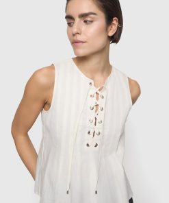 The Becca Pleated Top is a sleeveless design with intricate pintucks that release at the front and back, creating a beautifully textured silhouette. The V-neckline is finished with self-lacing ties and metal cord ends, threaded through metal grommets for easy adjustment and a refined touch.