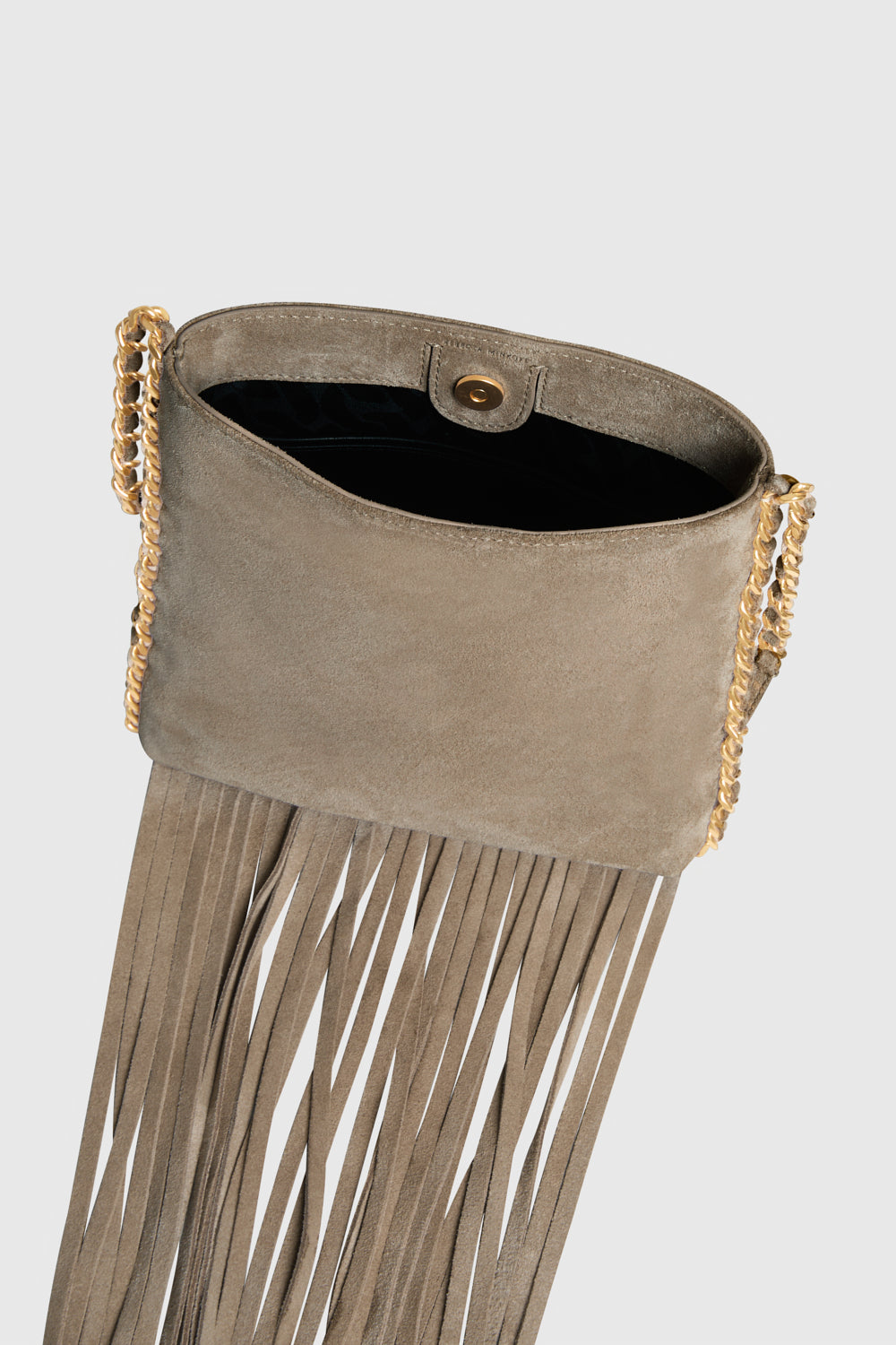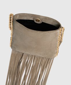 Stay on trend this season with the Carly North South Fringe Crossbody. This suede handbag features fringe details hanging, antique brass hardware with a chain detailing along the sides, and a crossbody adjustable strap. Bring this bag anywhere and everywhere.