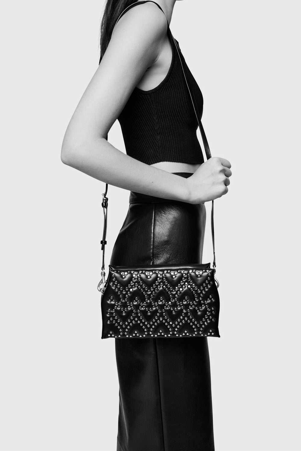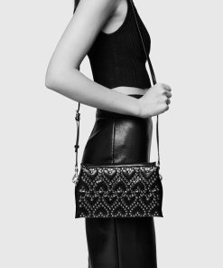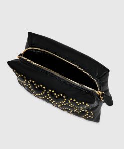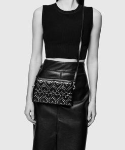 This crossbody bag combines a sleek black silhouette with playful heart-shaped stud patterns in gold-tone detailing. Compact yet roomy enough for your essentials, it features an adjustable strap for versatility and a zipper closure to keep everything secure. It’s the perfect accessory to add a touch of charm with a little edge.