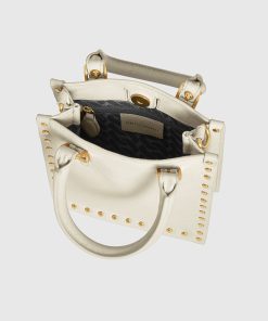 The Studded Mini Tote is a stylish and compact companion for your everyday essentials. Crafted from soft and luxurious leather, it features antique brass stud detailing along the edges for a bold, modern touch. With a detachable strap and magnetic snap closure, this tote seamlessly transitions from handheld elegance to crossbody convenience.
