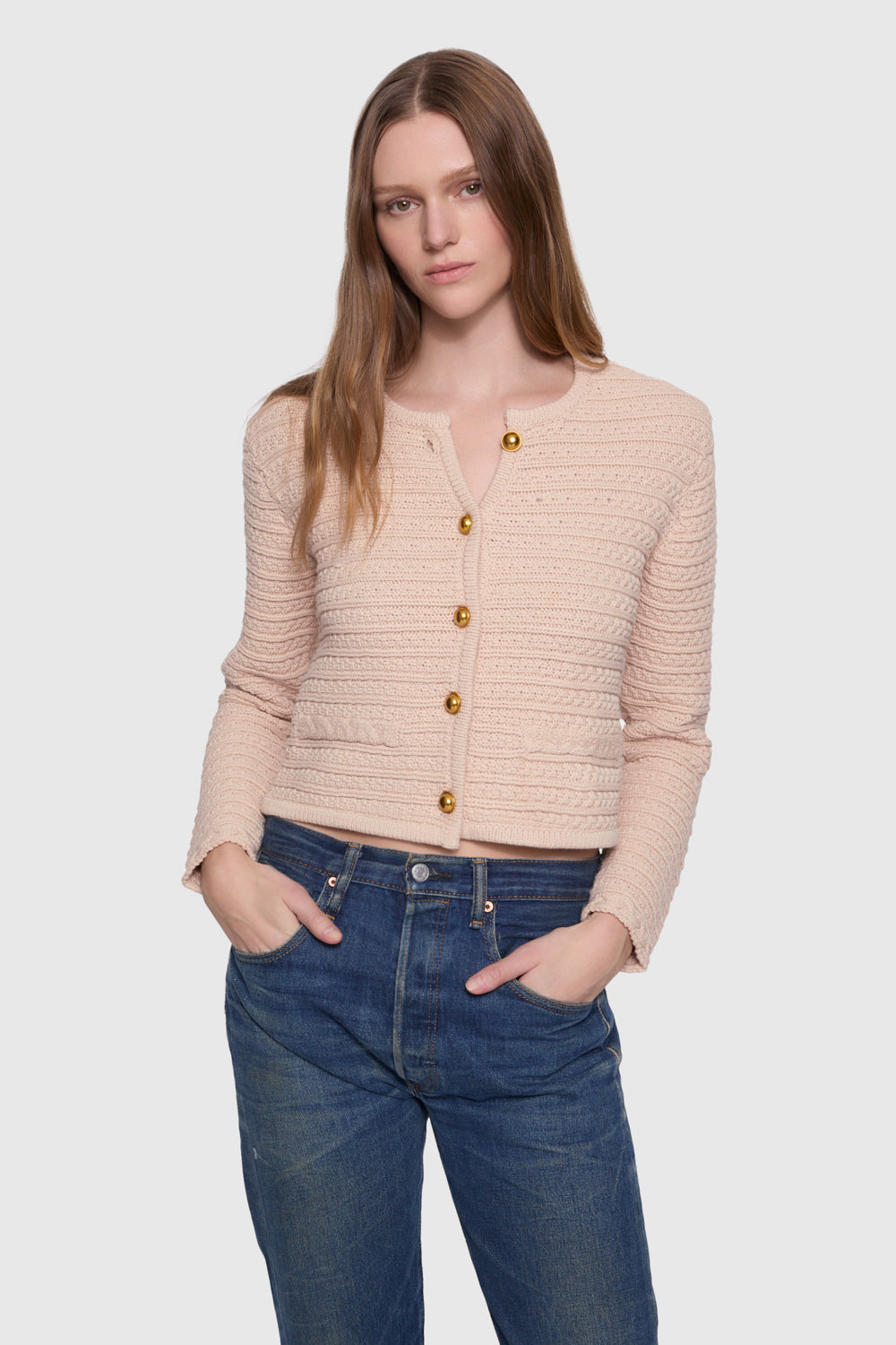 The Isla Braided Cardi is a cozy, cable-braided knit cardigan featuring dome snaps at the center front placket for a modern twist on a classic design. With its intricate texture and relaxed fit, this cardigan is perfect for layering over any outfit.