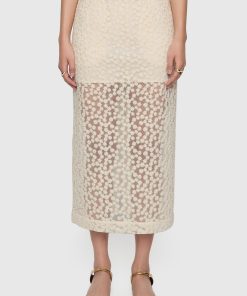 The Jaci Midi Lace Skirt features intricate floral lace with a half-lined design, creating a sheer finish at the bottom for an ethereal touch. A subtle slit at the center back ensures ease of movement, making this skirt both elegant and practical.