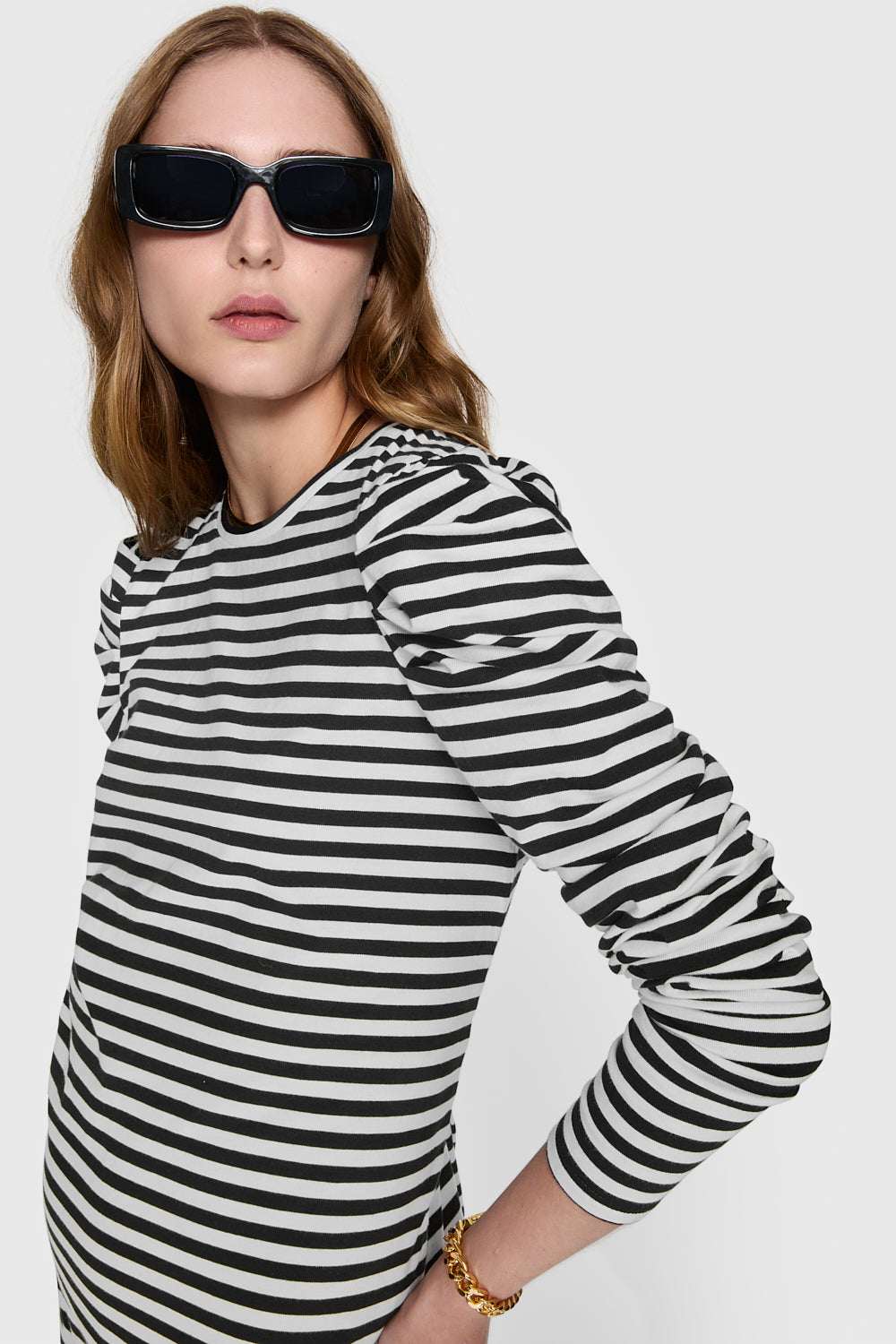 The Janine Dress effortlessly blends comfort and elegance with its pleated long sleeves and high neckline. Crafted from 100% cotton jersey, it features a straight silhouette, offering versatile styling options from day to evening.