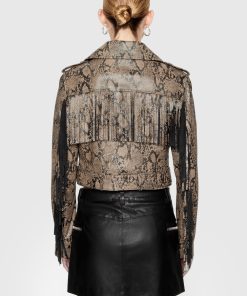 The Janis moto jacket is a style that transcends seasons. This standout iteration is rendered in a maximalist python printed foil with playful fringe, silver-tone fastenings and a buckle waist belt.