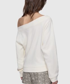 The Kora Off Shoulder Sweatshirt is a relaxed knit top that drapes off the shoulders for a laid-back look, featuring ribbed openings and a ribbed neckline for a touch of texture.