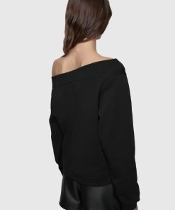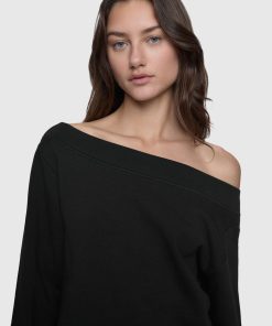 The Kora Off Shoulder Sweatshirt is a relaxed knit top that drapes off the shoulders for a laid-back look, featuring ribbed openings and a ribbed neckline for a touch of texture.