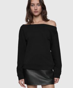 The Kora Off Shoulder Sweatshirt is a relaxed knit top that drapes off the shoulders for a laid-back look, featuring ribbed openings and a ribbed neckline for a touch of texture.