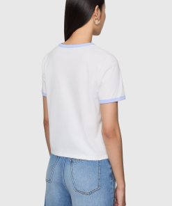 The Niki T-Shirt is a short-sleeve tee featuring a bold Hamptons logo, with a classic crew neckline and periwinkle trim at the sleeve openings. Its simple yet stylish design offers a fresh, laid-back vibe.