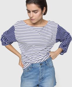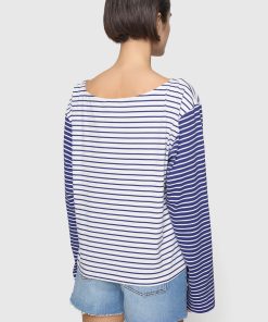 The Ruby Stripe Pocket Tee is a periwinkle and white striped long-sleeve with a boat neck, featuring a retro stripe combo at the sleeves. Its relaxed, nostalgic design brings a timeless charm to any wardrobe.